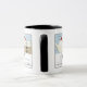 Uma cinza e um gato branco no balcão de uma cozinha com uma caneca de café. O gato bonitinho está tentando empurrar a caneca do balcão da cozinha para fora como gatos gostam de fazer.
