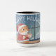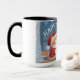Cute illustration of a chubby orange tabby cat dressed as Santa, holding a steaming mug.
