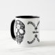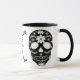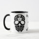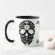 Este Dia Único do design de Mortos captura aspectos-chave desta celebração mexicana. Um crânio de açúcar é uma tradição que se destaca nas celebrações do Dia dos Mortos, que começa no final de outubro até o início de novembro. Este design preto e branco é simples mas atraente para os olhos. Esta caneca pode ser personalizada adicionando seu próprio nome ou texto.
