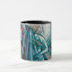 Um trabalho de arte apresenta uma mulher semimabstrato com um xale/véu em tons azuis, brancos e cor-de-rosa.