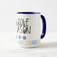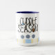 Mágina branca e azul da estação de charada com galho de árvore, pássaro cantor, fundo de xadrez e flocos de neve.