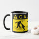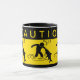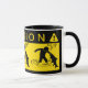 Sinal de precaução amarelo e preto com um peixe tentando comer uma figura de palito.