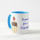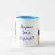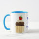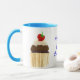 Uma caneca branca de Ringer com uma jante azul em pó e uma alça com um cupcake de chocolate em cada lado, tocada com um morango e creme. "Qualquer um por um cupcake" é escrito entre os dois cupcakes a azul. O design é de uma colagem de papel pintada à mão por Judy Adamson. Você também pode estar interessado em ver outras designs de cupcake de Judy Adamson em cumprimentos a cartões e camisetas.