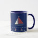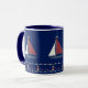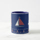 Um veleiro de brinquedo azul giro com uma vela vermelha e azul listrada flutuando sobre um fundo azul real.