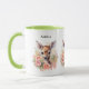 Uma caneca com uma bela ilustração com um veado fofo. Cercados por rosas e flores cor-de-rosa.