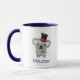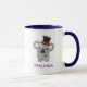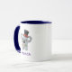 Uma caneca de café com uma ilustração de uma cinza engraçada que come algumas folhas de eucalipto, vestindo um chapéu preto rico com fita vermelha. Personalize com um nome.