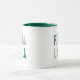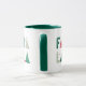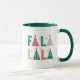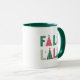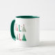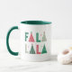 Uma caneca de férias bonitinha, branca e moderna, com as palavras FA LA LA LA, desenhada à mão. Os As são representados por árvores de Natal.