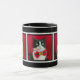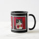 This cute kitty mug features a tuxedo cat wearing a red bow tie for the Christmas season. The design is repeated around the mug to make an adorable kitty cat mug. Copyright Peaches the Tuxedo Cat