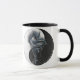 O design nesta caneca da campainha é um dragão chinês azul suportado por um símbolo preto e branco de Yin Yang. Uma pequena quantidade de fumo aumenta da base do emblema de Yin Yang. Esta criatura celestial, o dragão chinês é forte, aventurosa e que parte. É energia é tipicamente yang.