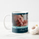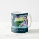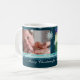 A caneca feita sob encomenda da foto da mamã do Feliz Natal em máscaras à moda do azul da cerceta e a turquesa em um teste padrão delicado do floco de neve com texto customizável e foto, aperfeiçoam como um presente de época natalícia.