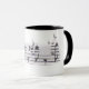 Caneca branca com punho preto, e um tema musicial.