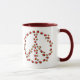 O símbolo de paz feito com joaninhas igualmente chamou joaninha, insetos da senhora, besouros de senhora em uma caneca com guarnição vermelha.