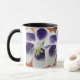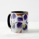 Flores brancas e roxas, fundo amarelo, laranja, vermelho. Design de colagem de arte abstrata na caneca.
