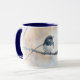 Esta caneca da natureza apresenta minha fotografia original de um pássaro Dark-eyed Junco sentado em um galho de árvore. Eu processei minha fotografia com um estilo sonhador de pintura em aquarela para dar um toque artístico. O cabo e o interior da xícara são azuis-arc para complementar a obra de arte.