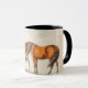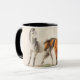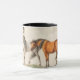 Esta caneca equina apresenta um par de cavalos ilustrados ao estilo vintage. Eu processei esta imagem com um estilo de pintura em aquarela para dar um toque mais artístico. O cabo e o interior da xícara são pretos para complementar a obra de arte.