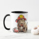 Caneca engraçada e ligeiramente indiscreta de bombeiro com um cachorro usando capacete de bombeiro com um osso queimado e um extintor de incêndio usado. Perfeita para colegas de trabalho e bombeiros que apreciam humor ousado e sarcástico.