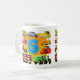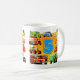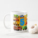 Caneca feita sob encomenda do caminhão da construção do aniversário do quinto aniversário. Nove caminhões coloridos brilhantes cercam um grande número grande 5! Adicione sua própria idade! Um misturador de cimento verde e amarelo, azul pegara o caminhão, escavadora amarela, caminhão de descarregador alaranjado, rolo de estrada vermelho, trator e reboque verde, firetruck vermelho grande, escavador amarelo e o caminhão vermelho de um construtor! Mais grandes ideias para a festa de aniversário temático de um miúdo do caminhão de TruckStore