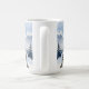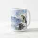 A pretty wildlife coffee mug with an illustration of a majestic snow leopard perched on a craggy, snow-covered peak, gazing out at a vast, frozen mountain range.