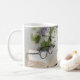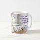 Um vaso de lilás, óculos, livro e uma xícara de chá, uma imagem calmante com palavras da Bíblia "O Senhor dará força às suas pessoas; o Senhor abençoará suas pessoas com paz" Personalize a caneca com texto de sua escolha, e é fácil mudar a imagem também se você quiser.