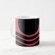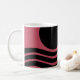 Esta caneca tem design Bauhaus de linhas onduladas e círculos em preto num campo de cor-de-rosa profundo.