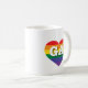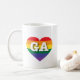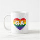 Esta caneca tem um coração de orgulho arco-íris sobreposto pelas letras maiúsculas brancas e negrito GA, a abreviação oficial para Georgia, o estado de pêssego. Mostre suas cores verdadeiras, apoie a igualdade do casamento e comemore a orgulho gay.