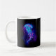 Água-viva grande, azul, desenhada artisticamente, brilhante, brilhante, com longos tentáculos sobre fundo preto com bioluminescência roxa. Água-viva luminosa.