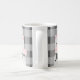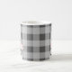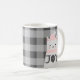 Caneca bonito da época natalícia com uma ilustração de um gato branco que veste o beanie cor-de-rosa e o lenço feito malha. Fundo checkered do guingão do carvão vegetal. Na barriga do gato diz a "alegria." Design doce do inverno para amantes do gato.