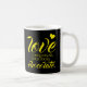 Adicione um toque de humor de comida à sua bebida favorita com esta caneca, que mostra o ditado "Amor Conquista Tudo, Mas O Chocolate Também." Design e Copiar © W.H. Sim. Todos os Direitos Reservados. Mais informações em zazzle.com/wordsofwhimsy