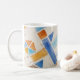 Caneca com estampa em aquarela com formas geométricas nas cores base, laranja e azul, pintadas de maneira intuitiva e coordenada pra deixar espaços harmônicos entre os formatos, tornando a obra única e agradável aos olhos