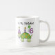 Uma tartaruga de sorriso verde bonito que veste um chapéu do partido leva uma vela iluminada do aniversário em sua parte traseira e o texto lê o " É meu Birthday". Um balão do hélio leva o número 6!