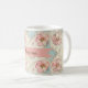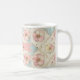 Um padrão de patchwork com aplicação floral com flores rosa e marfim grosseiramente costuradas em tecido azul e marfim, com renda gasta e cor de ecru dá a esta caneca um visual desgastado e chique que você vai adorar. Parece um velho edredão, esquecido num sótão. Muito feminino, perfeito para qualquer pessoa que ama costurar.