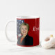 Esta caneca caracteriza uma imagem de Hillary Clinton na frente da bandeira americana, com um fundo vermelho e o texto, "apronta-se para Hillary 2016".
