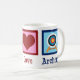 Um belo presente de arqueiro. Uma bela caneca do Peace Love Archery com um sinal verde de paz, coração vermelho e um alvo para um arqueiro.