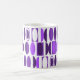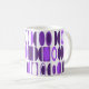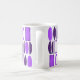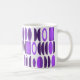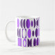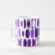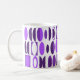 Esta caneca tem um design de arte feito de ovais e meio ovais em branco e tons de roxo.