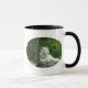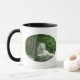 Lobo ártico branco que descansa em uma caneca de café da rocha.