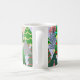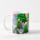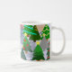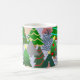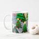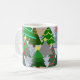 Esta caneca tem uma design de árvores de Natal em vários tons de verde, rosa, prata e ouro com diferentes decorações.