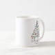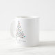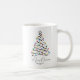 Mug de Café de Árvore de Natal Personalizado. O design minimalista apresenta um simples rabisco de árvore de Natal com luzes coloridas e mensagens personalizáveis, nomes de remetentes e ano - tudo em letras elegantes em fundo branco.
