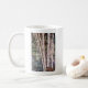 Impressionista pintura mestiça de um riacho correndo pela borda do sol de uma floresta de árvores brancas por Sheryl Karas.