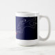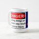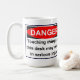PERIGO! As coisas tocantes nesta mesa podem conduzir a ferimento sério. Caneca engraçada. Um lado tem um sinal de aviso, o outro lado tem um corpo esboçado no giz que toca "no grampeador vermelho legendário" da sabedoria do escritório. Os inclinações da cor do fundo de um azul escuro, ao preto da cena do crime do passeio.