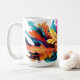 Esta é uma abstrato com uma explosão de formas vibrantes e coloridas que se assemelham a folhas estilizadas ou penas. As formas são fluidas e dinâmicas, sugerindo movimento e um efeito semelhante a um splash. A paleta de cores é rica e saturada, dominada por tons de laranja brilhante, magenta profunda, chata vibrante e roxo profundo, todos se misturando em um arranjo orgânico fluente contra um fundo de cinza de luz.