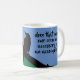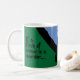 O texto personalizável diz: "Se um bando de corvos é um assassinato...isso faz de um corvo um acessório ou um cúmplice? É acompanhada da silhueta preta de um corvo empoleirado num galho. O galho corre diagonalmente de cima para baixo, dividindo a caneca. O fundo é verde abaixo do galho e azul acima dele. Um presente de bobo para advogados, passarinhos, observadores de pássaros, ornitólogos, ou aqueles que gostam de jogos de palavras.