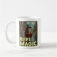 Esta imagem balnear apresenta um feiticeiro parado por um rio numa área florestal, segurando uma vara de pesca com um peixe flutuando em direção à linha. Vestido em trajes de bruxo tradicionais, incluindo um roupão longo e um chapéu pontiagudo, o bruxo lança um feitiço mágico durante a pesca. O fundo, com árvores e montanhas, cria uma atmosfera mística e serena. O texto "REEL MAGIC" exibido com destaque na parte inferior da imagem, adiciona um toque humorístico e mágico à cena.