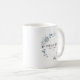 Esta caneca para a festa de casamento apresenta elegantes flores em azul empoeirado e branco e uma fonte minimalista elegante. É perfeita para qualquer festa de casamento