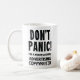 Esta deliciosa caneca branca apresenta a frase "Não entre em pânico! Eu sou um escritor publicitário profissional. É perfeito para qualquer pessoa no campo do marketing, seja no escritório ou para uma ocasião especial como uma promoção. Uma ideia de presente da equipe de excelentes para aqueles que artesanato mensagens convincentes e precisam de seu café consertado enquanto brainstorming.