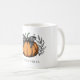An earthy fall coquette pumpkin mug design on rustic wood with a autumn vibes theme. Perfect for Thanksgiving, celebrating autumn, and the cozy vibe we need when the weather turns brisk! Time for pumpkin lattes and hot chocolate. Burt orange wood, foliage, and pumpkin with bow.