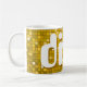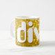 Mug com um padrão impresso estilizado, divertido e estilizado, de "azulejo espelhado disco" em tons de ouro e branco amarelos e texto retrô. Pode ser usado como um fundo para o seu próprio texto, imagens e ideias. Observe que esta é uma imagem de arte digital impressa, ela não brilha ou contém espelhos reais ou brilho.