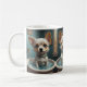Um filhote adorável sentado numa banheira, com gotas de água e bolhas à sua volta. Os animais e os animais de estimação olham para o espectador com olhos largos e inocentes, e suas pequenas patas estão na borda da banheira. A atmosfera é bonitinha e humorística, fazer ideal para um conjunto de poster.