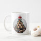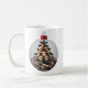 Bauble Lubrioles Baker Coffee Mug. Um belo bauble de Natal apresenta uma deliciosa torre de profiteroles, creme saindo, cercado por folhas sagradas, morangos vermelhos, e utensílios cozinheiros como um pino rolante, conselho e bolores, design perfeito para qualquer entusiasta ou padeiro apaixonado. Este é um presente adorável para adultos e crianças que amam o assar!