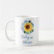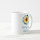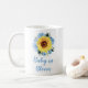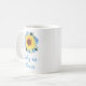 Esta caneca da futura mãe apresenta um design floral de aquarela com girassóis, rosas azuis empoeirados, folhagem e texto moderno.