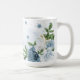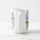 flores românticas azuis e brancas com algumas folhas verdes caneca de café botânica.